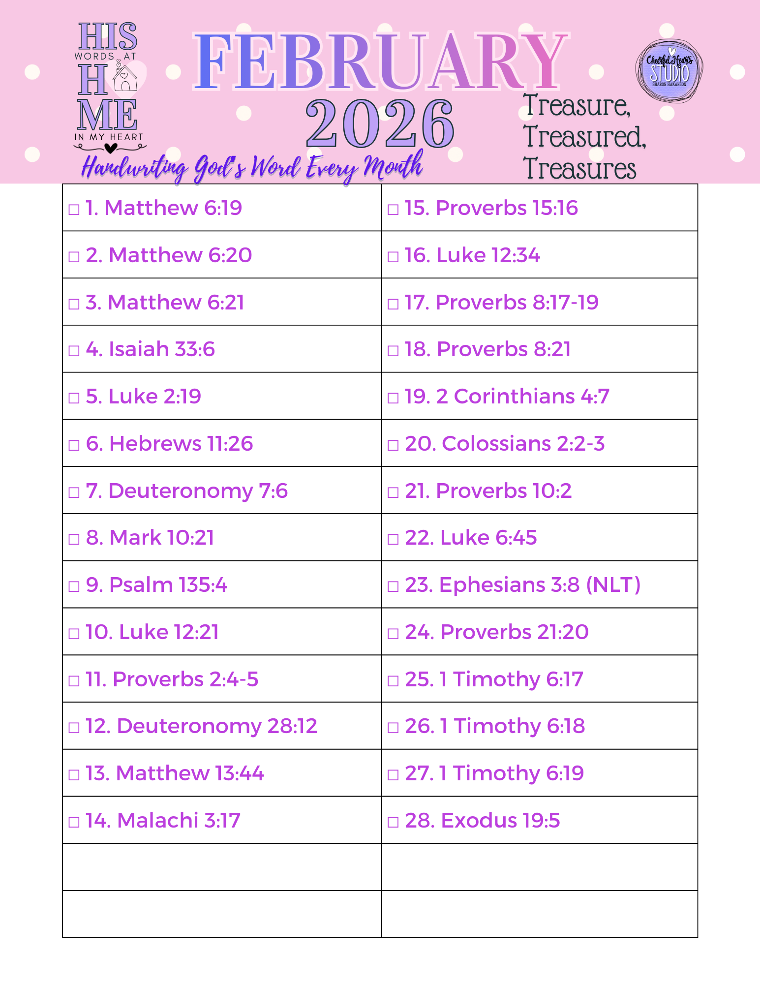 For February, our theme is ”Treasure, Treasures, Treasured” and we will be filling our hearts with the treasure that lasts…and reading and handwriting the daily verses will allow God’s words to have space in our hearts and minds!❤️