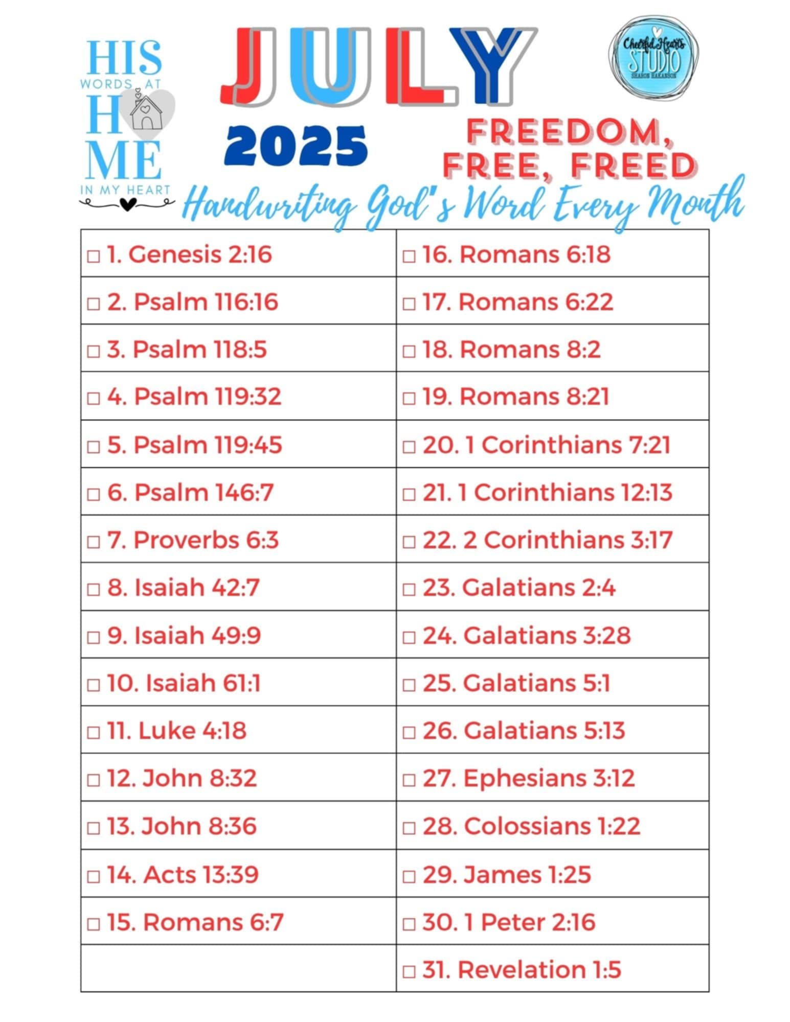 - I select a “focus or word” for each month, and for July our focus will be, “Freedom, Free, Freed”
