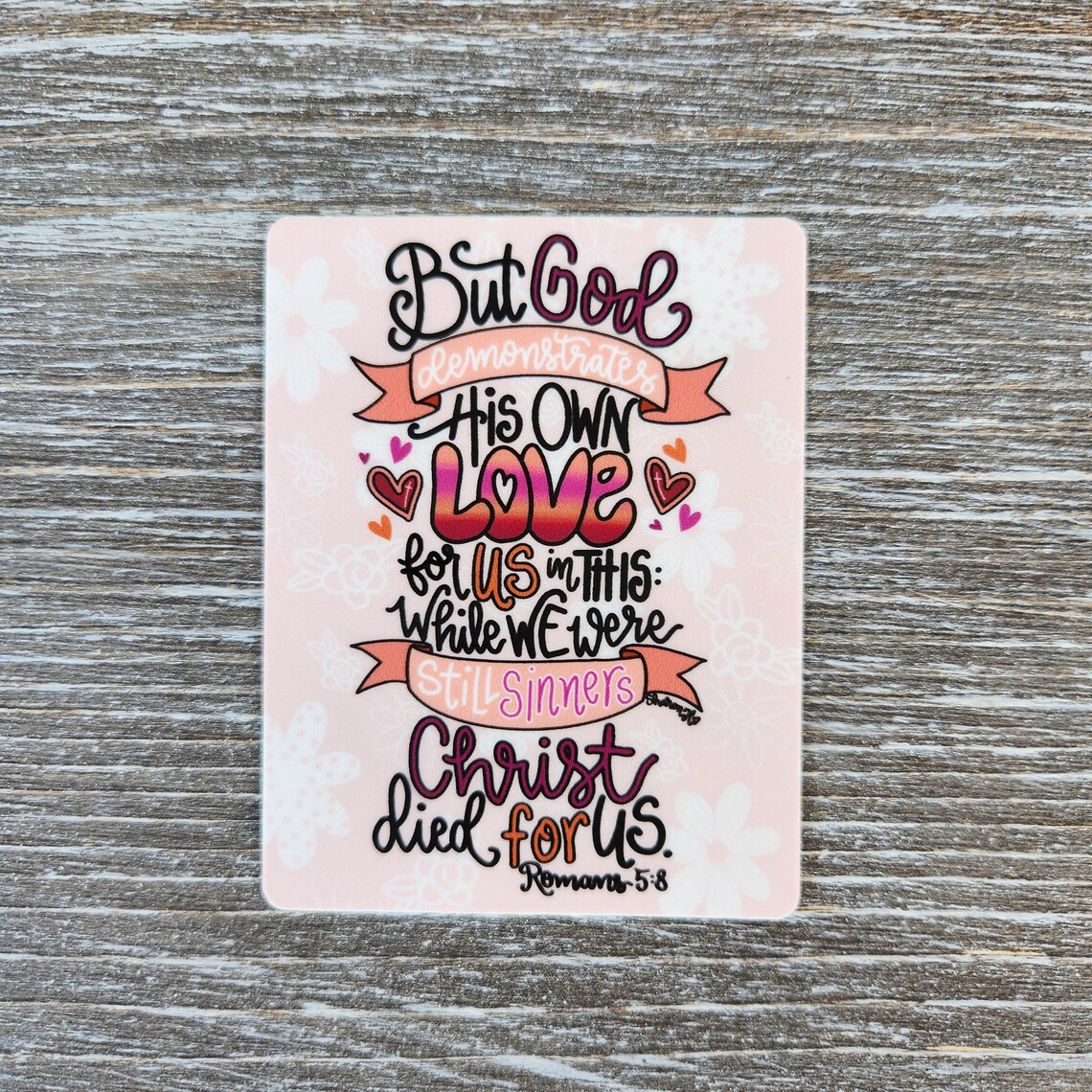 God Demonstrates His Own Love in This, Rom 5:8 Bible Verse Vinyl Sticker